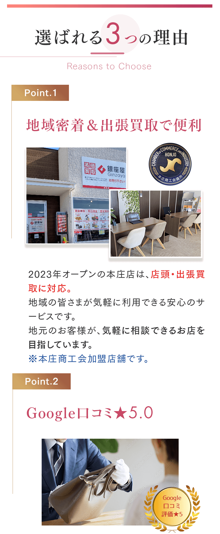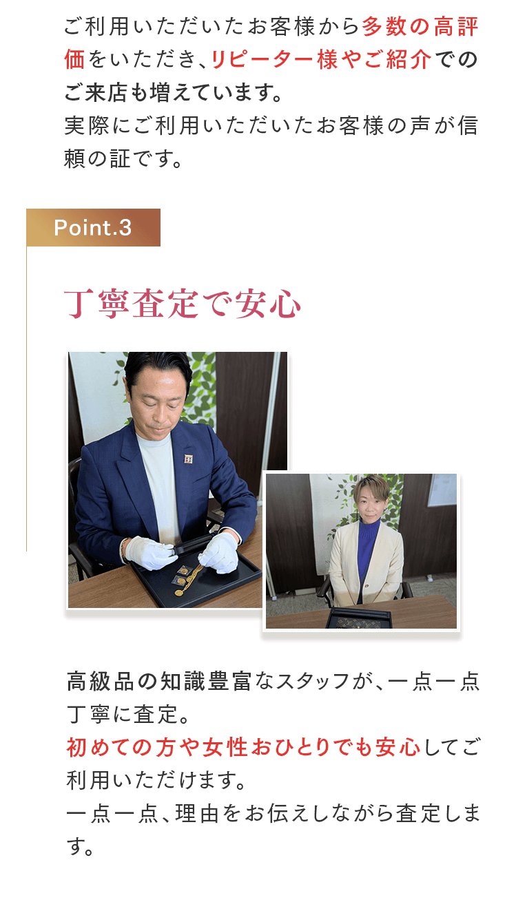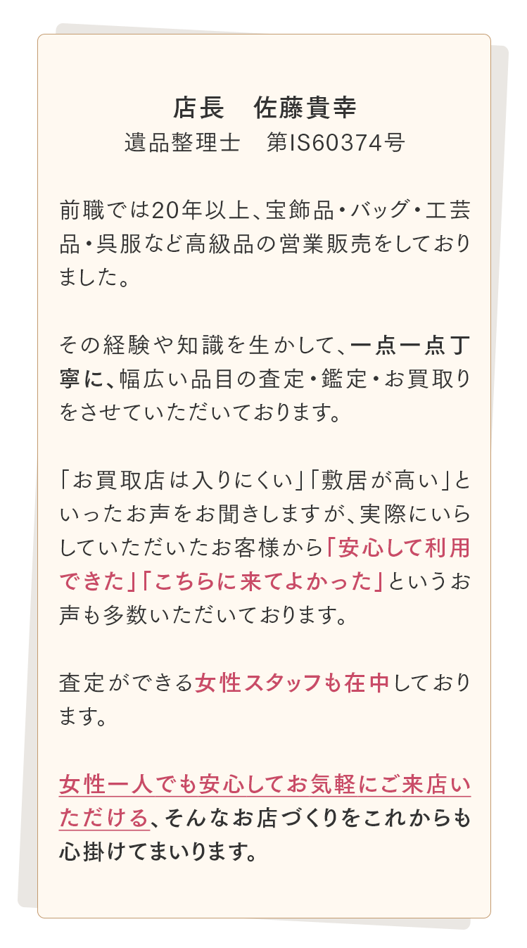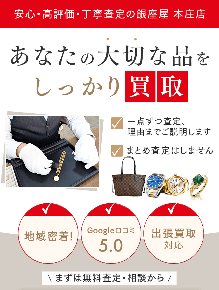 A. お店にお持ちになるのが大変な時はご自宅までお伺いし、出張査定をさせていただいておりま す。お電話でお気軽にご相談ください。